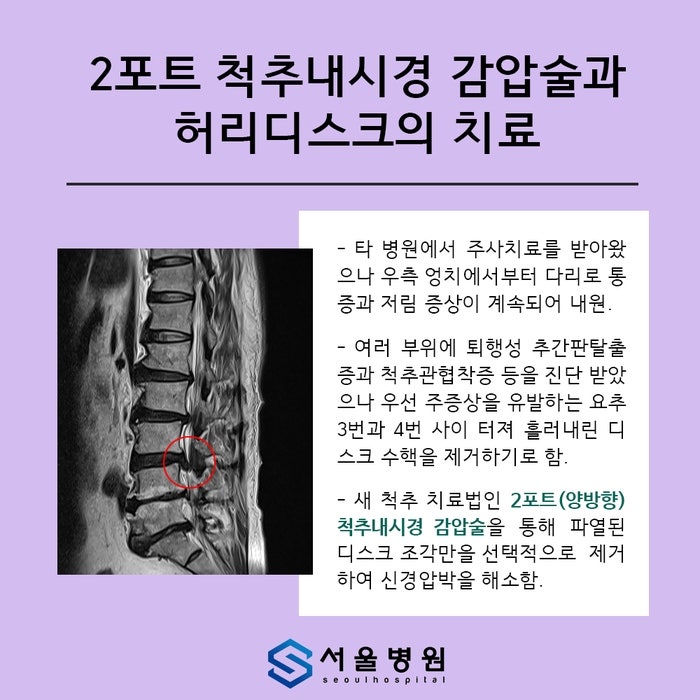 내시경적 감압술은 증상 호전을 위한 핵심 시술 중 하나로 ‘숙련된 의료진’의 중요한 고려사항으로 꼽힌다. 통증의 원인(추간판 탈출증, 인대, 척추 등)을 파악한 것을 바탕으로 환부를 제거하는데 1cm의 오차가 없고, 모두 의사의 판단과 미세수술에 달려있습니다… 가장 중요한 것은 매우 섬세한 의료진을 만나는 것입니다. 수술 중 실수로 신경을 만지면 상당한 비용과 시간을 투자해도 통증이나 증상이 악화될 수 있다. 아시다시피 저희는 교수진이 환자를 돌보는 독립적인 척추센터를 운영하고 있습니다. 꼭 저희 병원에 오셔야 한다는 말씀이 아닙니다. 상담 후, 내 질병에 대한 올바른 치료 방향을 조언하고 허리 통증을 제거할 수 있는 유능한 의료 전문가를 만나기를 바랍니다.글 하단에 링크 걸어두었습니다<如何检查你的技能>관련 칼럼. 시간을 내어 읽어보시면 병원 선택에 도움이 될 것입니다. 이 글을 보시는 분들도 제때 적절한 치료를 받으시고 편안한 일상을 되찾으시길 바랍니다. 다른 질문이 있거나 도움이 필요하면 아래로 문의하십시오. 긴 글 읽어주셔서 감사합니다. 서울 타르수스병원 – 필독 칼럼 – 서울요추디스크병원, 실력 테스트 비법은? 안녕하세요. 서울척병원에서 인사드립니다. 저희 서울척병원은 지난 15년간 “최대한 수술을…” 해온 blog.naver.com 디스크 탈출증 전문병원? 방문하기 전에 확인해야 할 “첫 번째” 항목 중 하나입니다. 만나서 반가워요. 서울척병원입니다. 서울척병원, 보건복지부 인증 척추병원 4회 연속 지정… 서울특별시 성북구로 47길 10 -찾아오시는 길- 서울척병원 이 글은 의료법 제56조 제1항에 의거하여 서울척병원에서 의료정보 및 광고를 제공하기 위한 목적으로 작성되었습니다. 환자에 따라 모든 치료 및 시술은 부작용이 있을 수 있으므로 진행 전 담당 의료진과 상담을 권해드립니다.
