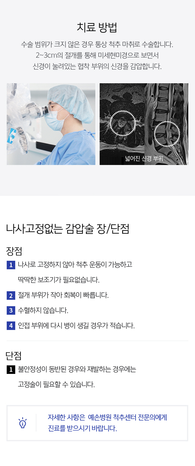 상대적으로 생소한 이름인 내시경적 감압술은 요추 추간판 탈출증이나 협착증 치료의 주요 시술 중 하나로 특별히 제작된 내시경과 치료 기구를 이용하여 신경에 가해지는 압박을 완화하거나 돌출된 뼈를 제거하는 시술입니다. 자세한 내용은 다음과 같습니다. 1. 2. 엎드린 자세에서 국소 마취. 1cm 정도의 작은 절개 후 내시경을 삽입하여 치료 부위를 확인합니다 3 . 척추관 협착증 환자, 요추 추간판 탈출증 환자 등에서 신경을 압박하는 척추 중앙의 관 제거, 디스크 넓히기/두꺼워진 인대, 뼈 탈출증 등을 고려해 볼 만하다. 발가락이나 발목이 저리는 등의 중증 증상을 보이는 환자도 드물지 않다. 하지만 위와 같은 질환으로 척추수술을 고려하고 계시다면 “큰 절개를 해야 하는 것 아닌가? 척추수술?” 하지만 내시경 감압술의 장점은 흉터가 매우 작고 근육에 손상이 적고 절개가 1cm 정도로 매우 작기 때문에 이 부분은 크게 신경쓰지 않으셔도 괜찮다고 생각합니다. 또한 내시경 카메라를 육안으로 관찰하면서 의료진은 시술이 진행됨에 따라 치료해야 할 부위의 상태를 자세하게 판단하여 적절한 치료를 할 수 있어, 수술도 잘되고 수술도 어려운데, 의료진의 기술력이 최우선이라고 할 수 있습니다.