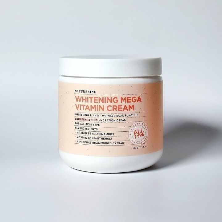 네이처카인드화이트닝메가비타민크림 기존에 쓰던 크림보다 엄청난 대용량 500g!!! 보통 쓰던게 50~100g인데 비하면 굉장하네요.