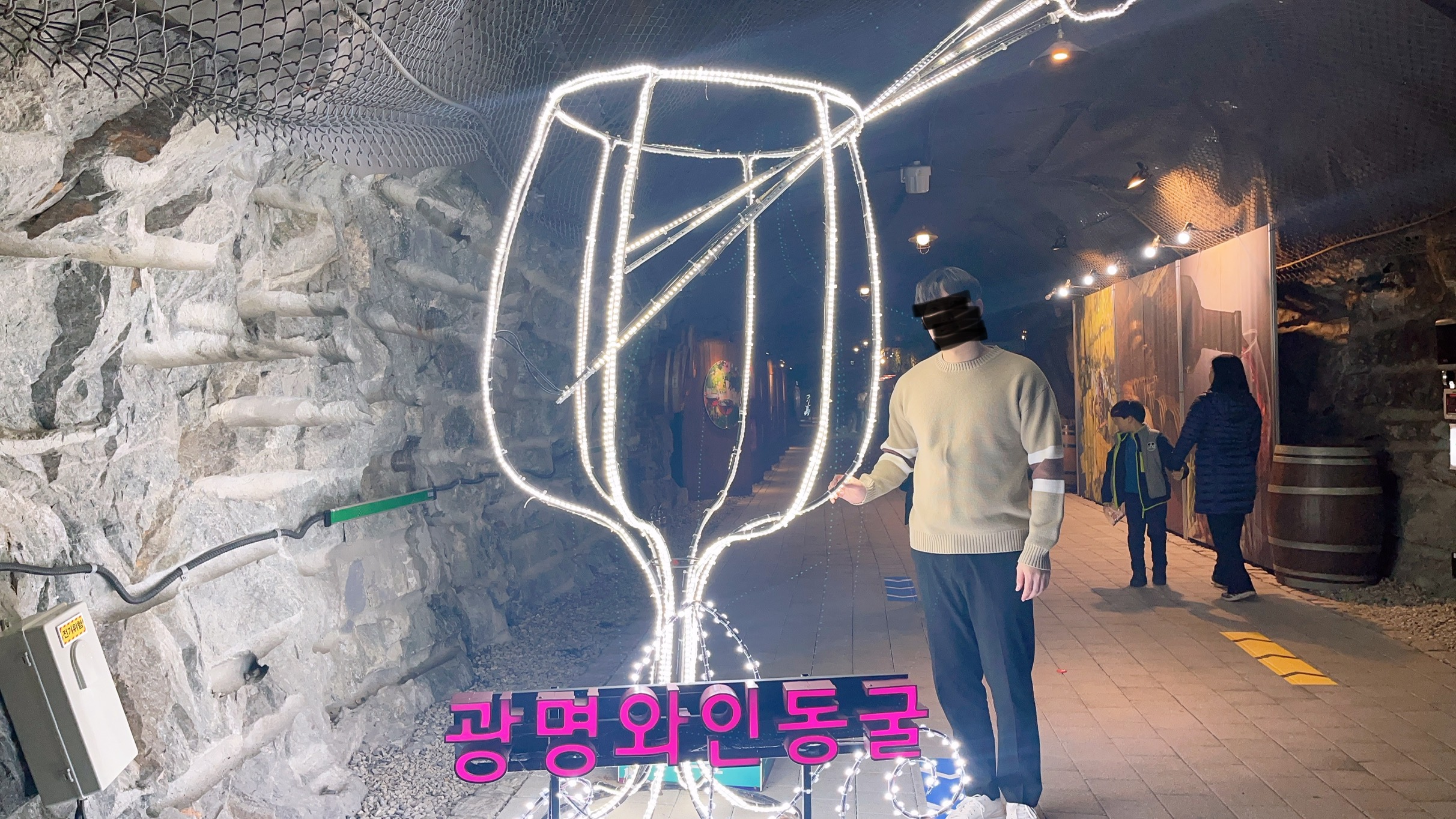걷다 보면 와인 동굴의 일부가 보이고 조명으로 만들어진 커다란 와인 잔에서 사진을 찍을 수 있습니다.