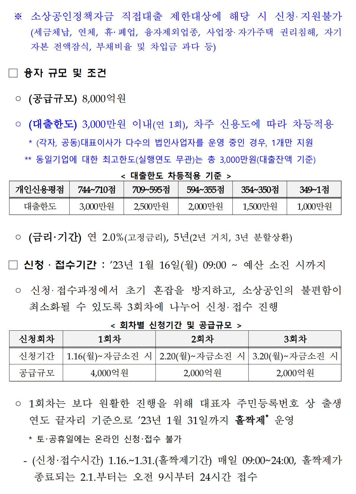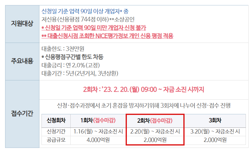 2023년 2월 20일 2000억 2차 소상공인 및 전통시장 자금조달 응모 기간은 응모 오픈 후 13분 이내에 소진되었습니다.