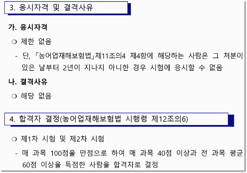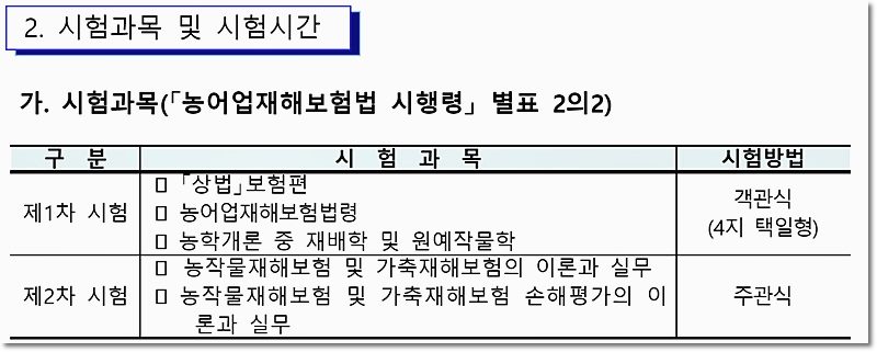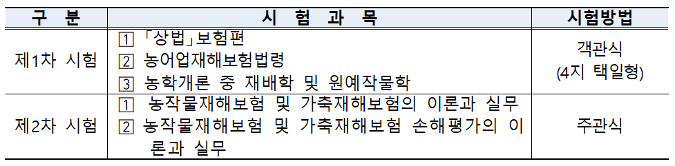 손해사정사가 하는 일 농어업재해보상보험상품은 자연재해로 농작물이나 가축이 유실된 농가에 출동해 피해 사실과 정도를 조사하고 실제 보험사고를 확인하거나 보상사유, 보험가입자가 보험료 청구 시 보험료 산정 방법 피해 정도 조사를 바탕으로 보험금 산정 및 지급 공통점 보험사고 조사 및 보험금 관련 업체, 독립사무소 심사 1차(복수) 선택) 6월 2차(서술형/단답형) 8월~9월 1차(객관식) 4월 2차(논문형식) 7월~8월 추진부 농림축산식품부 / 농업정책보험연구원 금융감독원