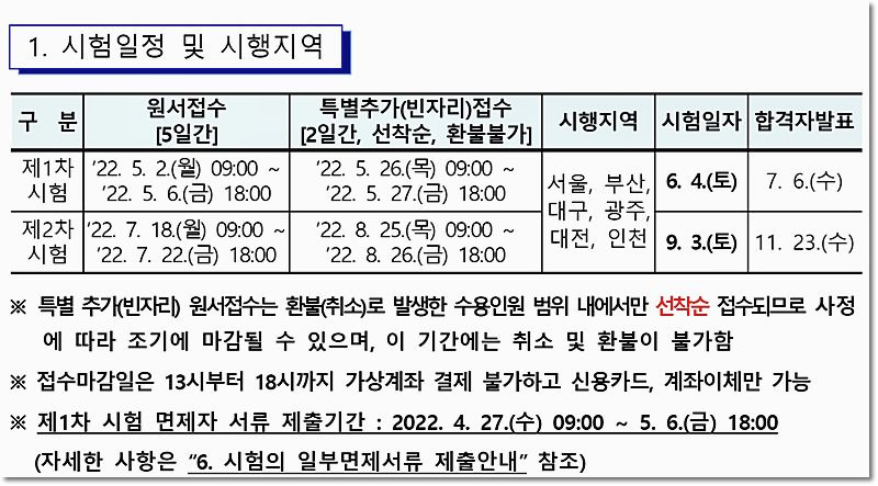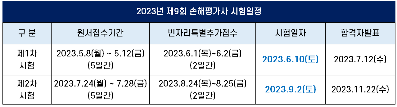 손해사정사의 일을 통해 인생의 새로운 도약을 이루고 싶다면 먼저 시험에 합격해야 합니다. 인증 시험은 연중 실시되며, Damage Assessor 시험은 1차 객관식 필기 시험과 2차 주관식 기술 시험으로 구성됩니다. 1차 시험에 합격하면 2차 시험을 보게 되며, 연말에 기말고사 일정이 잡힙니다. 2023년 시험은 1차는 6월 10일, 2차는 9월 2일, 최종 합격자는 11월 22일 발표된다.