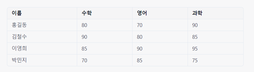 3. “김철수”라는 학생의 수학, 영어, 과학 점수의 합을 계산합니다.