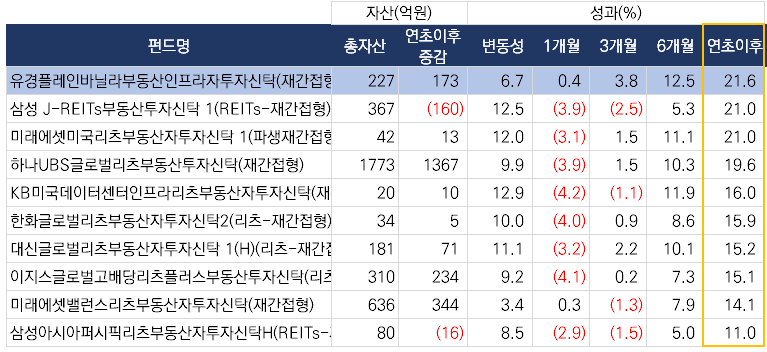 셋째, 글로벌 부동산 투자형 펀드입니다. 최근 9월의 시장 하락을 성공적으로 방어한 유교은풀바 부동산 인프라 펀드의 성과가 좋아요. 연초 이후 21.6%, 1년 기준으로 24.5%입니다. 최근 미국의 특수 리츠의 비중을 줄이고 국내 리츠와 인프라, CB투자 비중을 높였기 때문이죠. 종합 소득과 세금 부담으로 고민하는 분들은 부동산 펀드의 경우 올해 말이 마지막의 세제 혜택의 기회를 가질 수 있다는 점에서 관심을 가질 만 합니다. 당사는 일본과 미국의 가곡 또는 데이터 센터 같은 곳에 집중 투자하는 부동산 펀드보다는 글로벌로 분산된 리트 인프라 펀드가 매력적이라고 생각합니다. 유교은풀바 부동산 인프라와 하나 UBS글로벌 리츠가 규모도 일정 수준에 도달 상대 성과가 우수합니다.