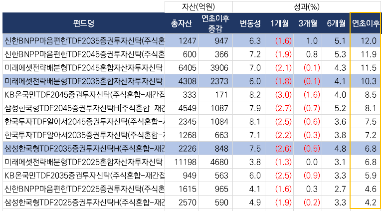 상소에 있는 IBK플레인 바닐라 EMP펀드는 연초 이후 6.3%, 누적 성과는 42%입니다(연율 약 19%, 운용 기간 990일). SP급 기준으로 9월 누적 성과가 약 46%까지 갔다가 다시 42%로 떨어진 것입니다. 며칠 전 IBK펀드의 책임 관리자들과 만났는데 그도 최근의 성과를 아쉬워했습니다. 그러나 IBK뿌루바 펀드는 과거 990일 동안 다양한 시장 행사에도 불구하고 연평균 수익률 19%를 달성했던 것처럼 이번에도 시간이 지나면 어느새 고점을 넘어설 것으로 기대하고 있습니다. 다음은 TDF펀드 중에서 몇개를 선별한 것으로 2025년/35년/45년 펀드입니다. 9월 1개월간 주식도 하락하면서 채권 가격도 하락하는 상황을 경험했기 때문에 TDF도 피할 수 없네요. 주식 편입비가 높은 장기 기간형 펀드는 연초 이후 10%대의 성과를 보여편입비가 낮은 펀드는 4~5%입니다. 미국 금리가 오를 경우 선진국 주식과 채권에 분산하는 펀드의 경우, 성과 부진을 겪기도 합니다. 과거 20년간 주식 채권의 역의 상관성을 활용한 자산 배분이 유용했지만 금리와 물가 상승기에도 가능할지는 지켜봐야 합니다.