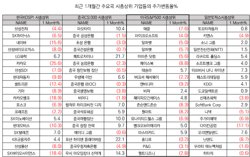 넷째, 해외 국가별 주식형 펀드, 주식형 펀드의 성과를 보기 전에 주요국의 시가 총액 상위 종목들의 최근 1개월의 성과에서 봅시다. 아래 표를 보면 국내에서는 최근 1개월 네이버가-15.6%, 카카오가-25.6%, 카카오 뱅크, 셀트리온, SK바사 등이 하락 폭이 크며, 중국은 홍콩과 미국 상장 ADR충격이 크게 본토는 큰 충격이 없습니다. 크게 줄어든 것이 헤이안 보험입니다만, 1개월~6.5%로 마오쩌둥과 페트로 차이나, 중국 여행 집단 같은 종목은 상승했습니다. 미국이 주인공이지만, 상위 메가 캡이 좋지 않습니다. 그렇다고 수비형 미드도 변하지 않습니다. 여기에는 없지만 리 오프닝 관련 식리칼 종목이 좋았다고 생각합니다.