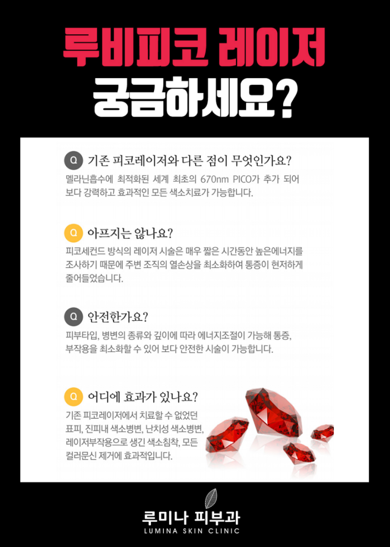 피코 토닝은 최근 몇 년 동안 가장 인기있는 색소 치료 방법입니다.시중에는 다양한 피코 레이저가 있으며 그 중 Enlighten Ruby 피코 레이저는 피코초, 나노초 및 세 가지 파장을 결합하여 어떤 색소이든 상관 없습니다. 피부톤에 상관없이 탁월한 제거효과를 발휘하는 프리미엄 마이크로 레이저 특히 670nm의 파장은 멜라닌 흡수력이 높아 가벼운 색소도 만족스럽게 제거할 수 있으며, 색소치료로 제거가 어려운 갈색 피부를 가진 동양인에게 표피 손상 없이 자극 없이 색소를 작은 조각으로 차단하고 세포 자극을 촉진하여 피부 깊숙이 침투하여 색소 결핍 부위의 진피가 빠르게 회복되도록 도와줍니다.