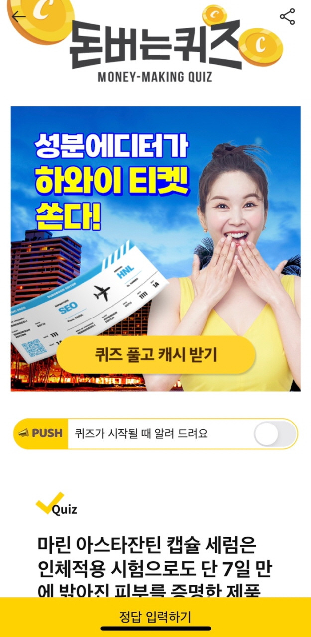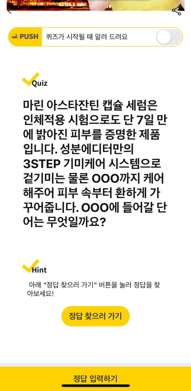 캐쉬워크 머니 메이킹 퀴즈 7.28 마린 아스타잔틴 캡슐 세럼 문제 ) 마린 아스타잔틴 캡슐 세럼은 인체 적용 테스트에서도 단 7일 만에 피부가 밝아지는 효과가 입증된 제품이다. 성분 에디터만의 3-STEP 주근깨 케어 시스템입니다. ○○○은 물론 ○○○까지 케어하여 속부터 투명한 피부로 가꾸어줍니다.