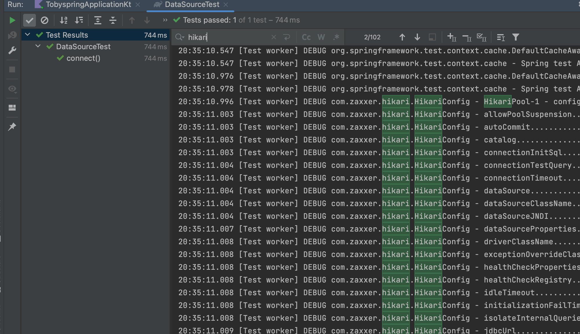 테스트 코드를 다시 실행하고 검증하면 Hikari를 검증할 수 있습니다.