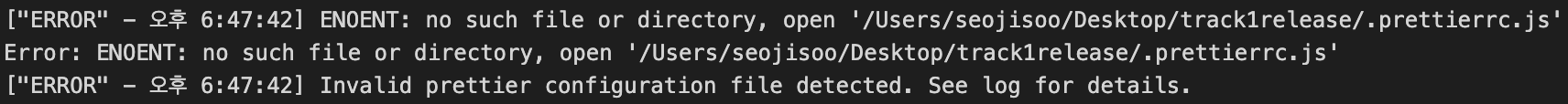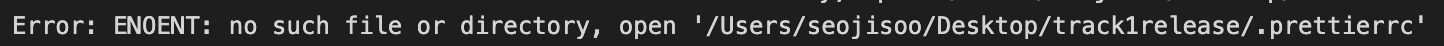 .prettierrc의 경로를 복사해 보니 /Users/seojisoo/Desktop/track1release/client/.prettierrc였습니다. 즉, 위의 오류 경로와 달리 클라이언트에 한 번 더 입력해야 했습니다.