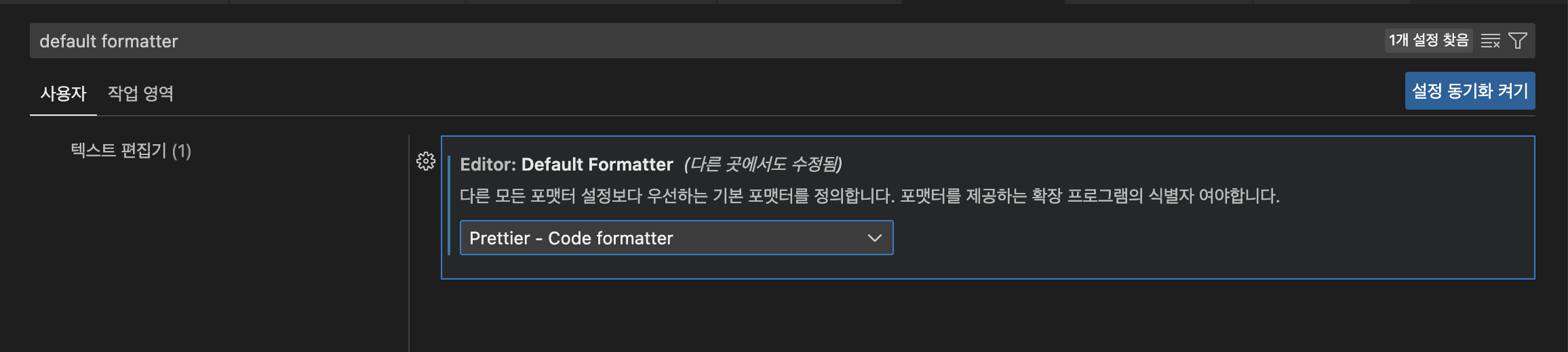 기본 포맷터를 Prettier – 코드 포맷터로 변경합니다.