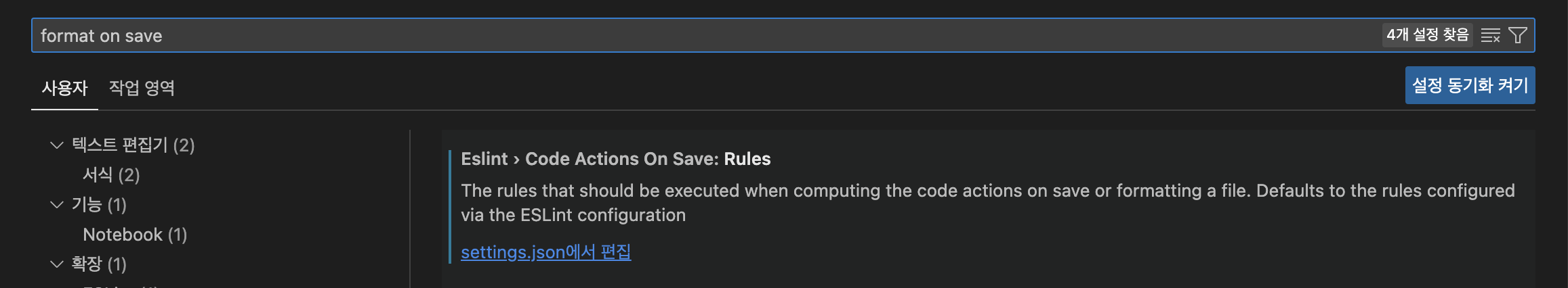 저장시 포맷 검색 후, settings.json에서 편집을 클릭합니다.