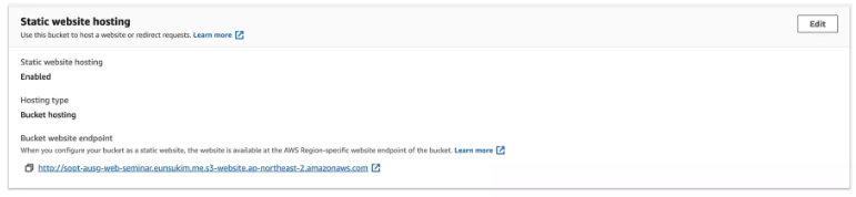S3 속성 > 정적 웹사이트 호스팅 섹션에서 웹 서비스 URL 사용 가능