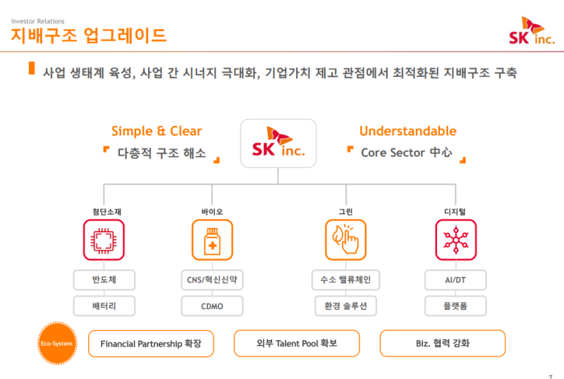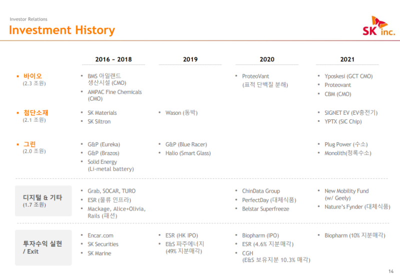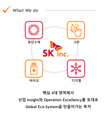 모두의 에너지 부재 속 SK의 남은 든든한 상장과 미래투자 SK해양플랜트 지난해 매출 6918억원, SK넥실리스와 1조4000억원 규모 동박 공동공급 계약 SK지오센트릭 플라스틱 재활용 공동공급계약 SK온스포드 유럽벤처플랜트 설립, 합작법인 블루발SK 2조원 투자확대, SK쉴더스 3조원 인수 등 세계 2위 그룹으로서 막대한 현금을 보유하고 미래를 위해 아낌없이 쏟아붓고 있다.